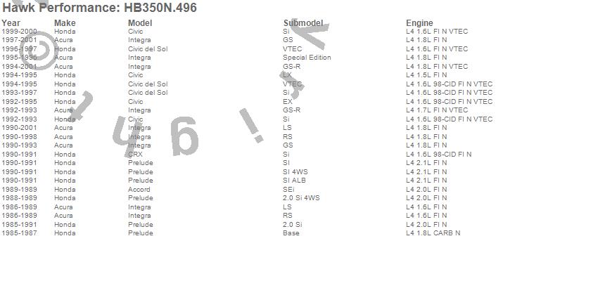 Below is an abreviated list of applications for the HP Plus Disc Brake Pad.Accord, Civic, Civic del Sol, CRX, Integra, Prelude, Acura, Honda, 2001, 2000, 1999, 1998, 1997, 1996, 1995, 1994, 1993, 1992, 1991, 1990 moreā¦