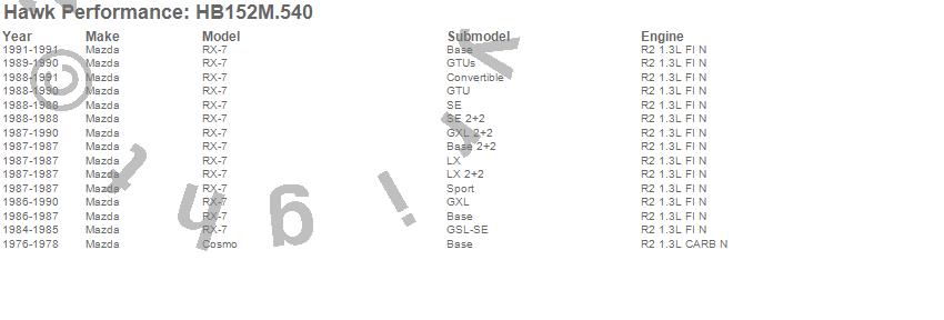 Below is an abreviated list of applications for the Black Disc Brake Pad.Cosmo, RX-7, Mazda, 1991, 1990, 1989, 1988, 1987, 1986, 1985, 1984, 1978, 1977, 1976 moreā¦