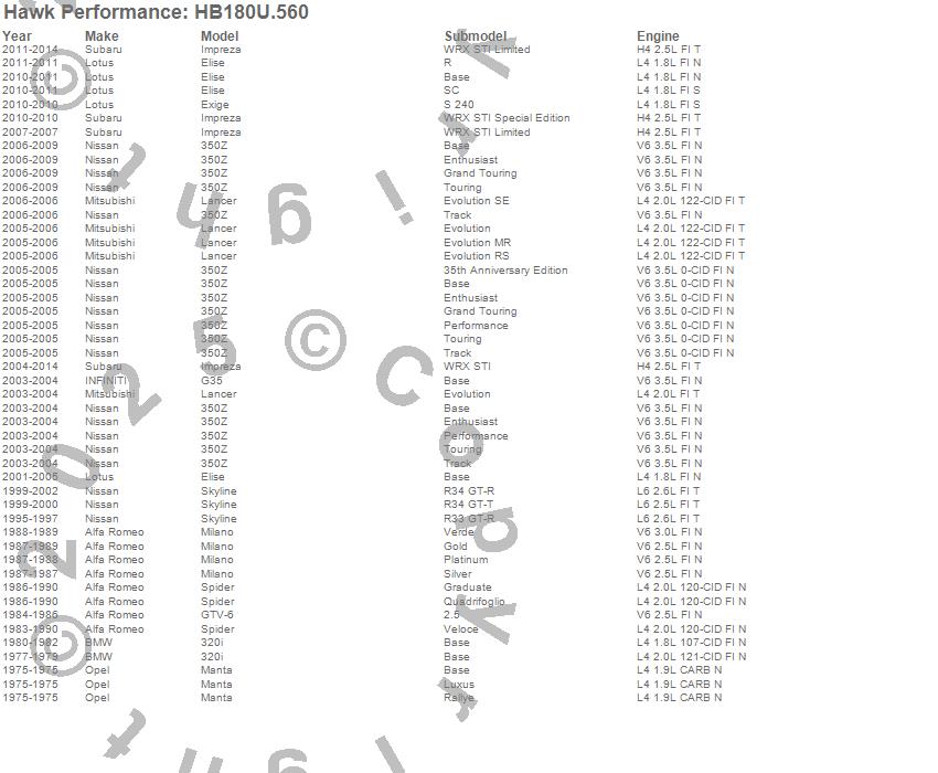 Below is an abreviated list of applications for the DTC-70 Disc Brake Pad.320i, 350Z, Elise, Exige, G35, GTV-6, Impreza, Lancer, Manta, Milano, Skyline, Spider, Alfa Romeo, BMW, INFINITI, Lotus, Mitsubishi, Nissan, Opel, Subaru moreā¦