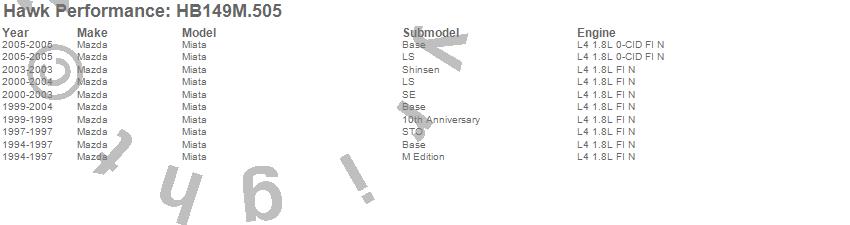 Below is an abreviated list of applications for the Black Disc Brake Pad.Miata, Mazda, 2005, 2004, 2003, 2002, 2001, 2000, 1999, 1997, 1996, 1995, 1994 moreā¦