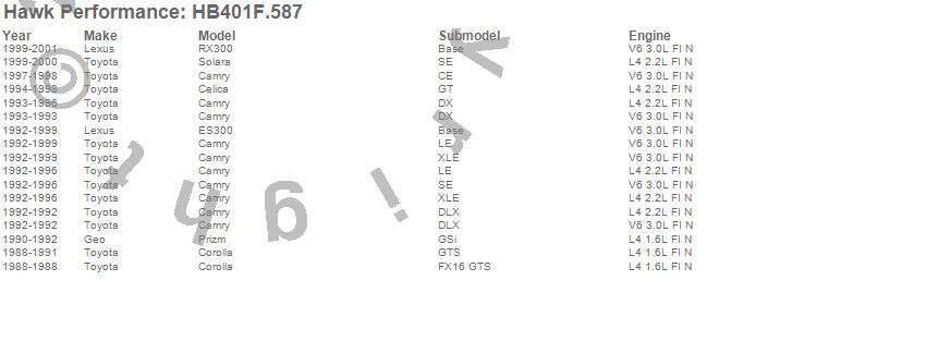 Below is an abreviated list of applications for the HPS Disc Brake Pad.Camry, Celica, Corolla, ES300, Prizm, RX300, Solara, Geo, Lexus, Toyota, 2001, 2000, 1999, 1998, 1997, 1996, 1995, 1994, 1993, 1992 moreā¦