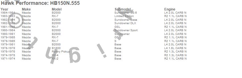 Below is an abreviated list of applications for the HP Plus Disc Brake Pad.B1800, B2000, Rotary Pickup, RX-2, RX-4, RX-7, Mazda, 1985, 1984, 1983, 1982, 1981, 1980, 1979, 1978, 1977, 1976, 1975, 1974, 1973 moreā¦