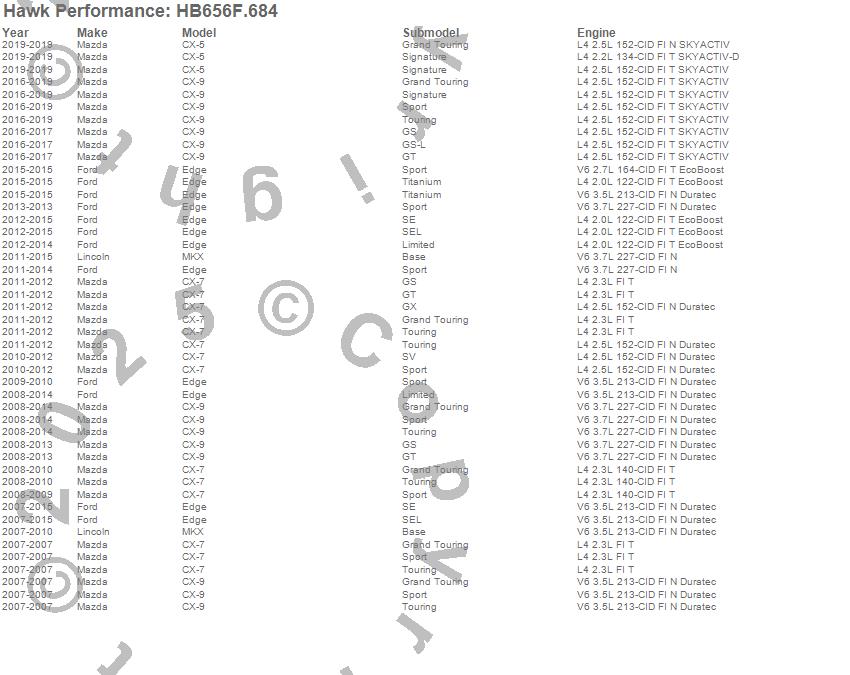 Below is an abreviated list of applications for the HPS Disc Brake Pad.CX-5, CX-7, CX-9, Edge, MKX, Ford, Lincoln, Mazda, 2019, 2018, 2017, 2016, 2015, 2014, 2013, 2012, 2011, 2010, 2009, 2008 moreā¦