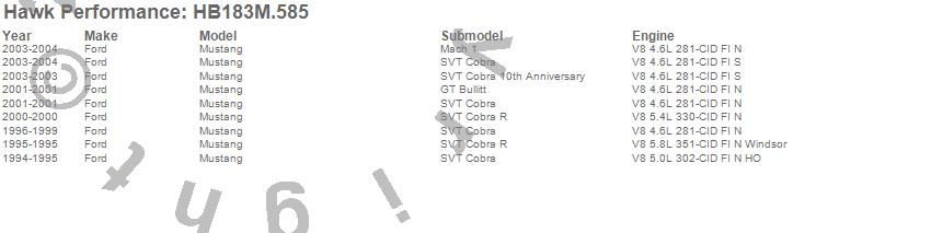 Below is an abreviated list of applications for the Black Disc Brake Pad.Mustang, Ford, 2004, 2003, 2001, 2000, 1999, 1998, 1997, 1996, 1995, 1994 moreā¦