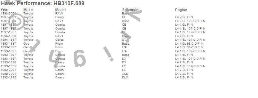 Below is an abreviated list of applications for the HPS Disc Brake Pad.Camry, Celica, Corolla, Prizm, RAV4, Geo, Toyota, 2001, 2000, 1999, 1998, 1997, 1996, 1995, 1994, 1993, 1992 moreā¦