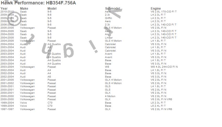 Below is an abreviated list of applications for the HPS Disc Brake Pad.9-5, A4, A4 Quattro, A6, C70, Passat, Audi, Saab, Volkswagen, Volvo, 2010, 2009, 2008, 2007, 2006, 2005, 2004, 2003, 2002, 2001 moreā¦