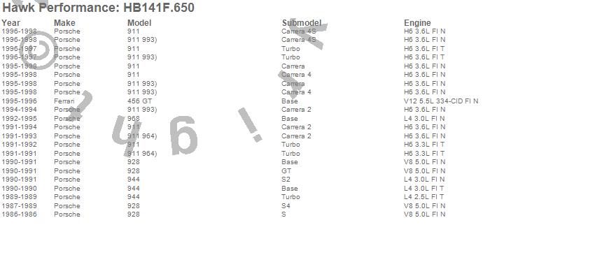 Below is an abreviated list of applications for the HPS Disc Brake Pad.456 GT, 911, 928, 944, 968, Ferrari, Porsche, 1998, 1997, 1996, 1995, 1994, 1993, 1992, 1991, 1990, 1989, 1988, 1987, 1986 moreā¦