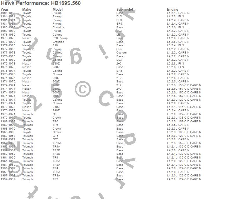 Below is an abreviated list of applications for the HT-10 Disc Brake Pad.240Z, 260Z, 280Z, 620 Pickup, 810, Corona, Cressida, Crown, GT6, Pickup, TR250, TR3, TR3A, TR3B, TR4, TR4A, TR6, Nissan, Toyota, Triumph moreā¦