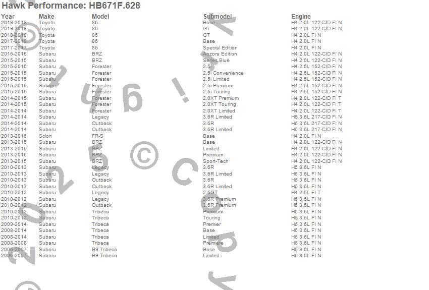 Below is an abreviated list of applications for the HPS Disc Brake Pad.86, B9 Tribeca, BRZ, Forester, FR-S, Legacy, Outback, Tribeca, Scion, Subaru, Toyota, 2019, 2018, 2017, 2016, 2015, 2014, 2013, 2012, 2011 moreā¦