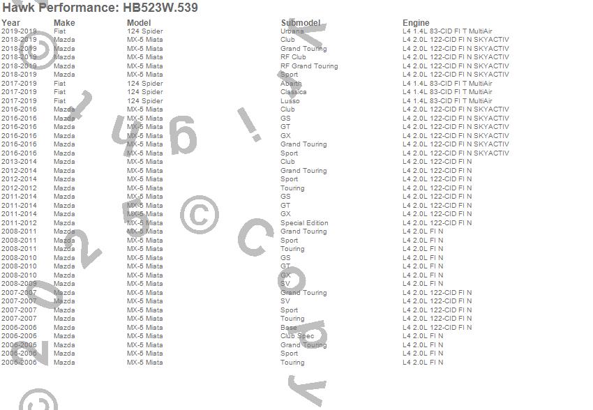 Below is an abreviated list of applications for the DTC-30 Disc Brake Pad.124 Spider, MX-5 Miata, Fiat, Mazda, 2019, 2018, 2017, 2016, 2014, 2013, 2012, 2011, 2010, 2009, 2008, 2007, 2006 moreā¦
