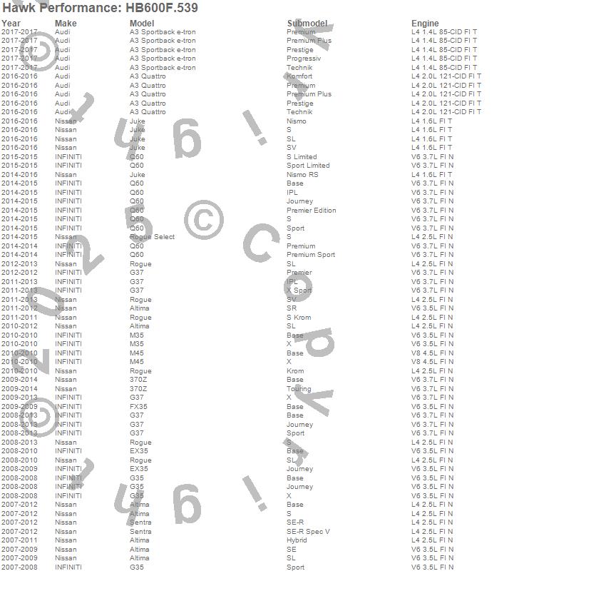 Below is an abreviated list of applications for the HPS Disc Brake Pad.370Z, A3 Quattro, A3 Sportback e-tron, Altima, EX35, FX35, G35, G37, Juke, M35, M45, Q60, Rogue, Rogue Select, Sentra, Audi, INFINITI, Nissan, 2017, 2016 moreā¦