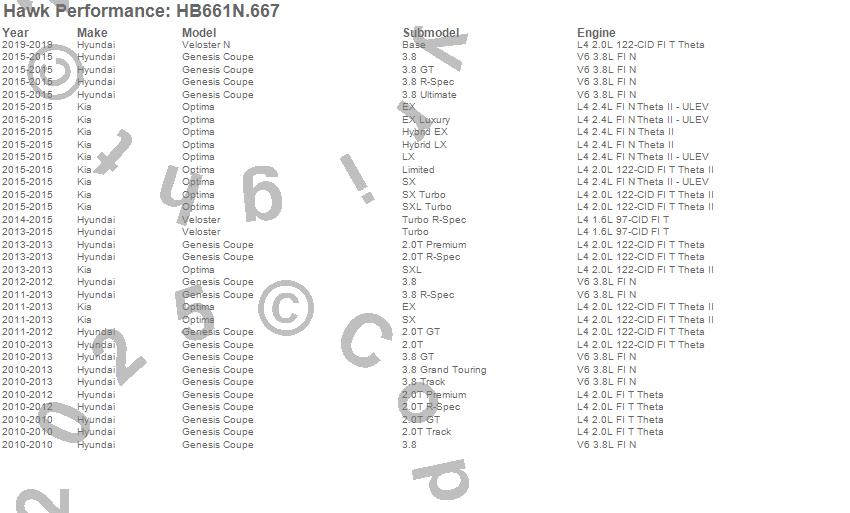 Below is an abreviated list of applications for the HP Plus Disc Brake Pad.