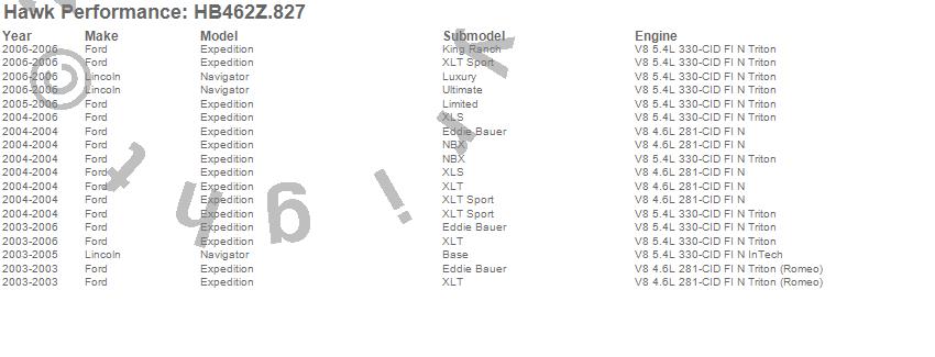 Below is an abreviated list of applications for the Performance Ceramic Disc Brake Pad.Expedition, Navigator, Ford, Lincoln, 2006, 2005, 2004, 2003 moreā¦