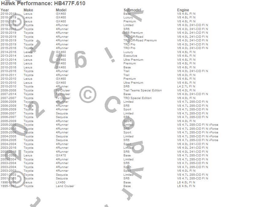 Below is an abreviated list of applications for the HPS Disc Brake Pad.4Runner, FJ Cruiser, GX460, GX470, Land Cruiser, LX450, Sequoia, Lexus, Toyota, 2019, 2018, 2016, 2015, 2014, 2013, 2012, 2011, 2010, 2009, 2008 moreā¦