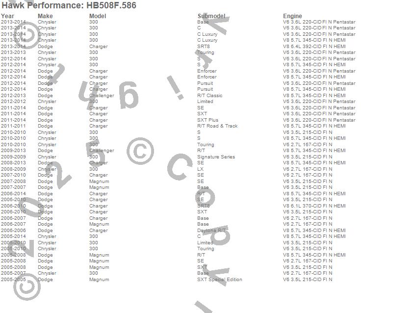 Below is an abreviated list of applications for the HPS Disc Brake Pad.300, Challenger, Charger, Magnum, Chrysler, Dodge, 2014, 2013, 2012, 2011, 2010, 2009, 2008, 2007, 2006, 2005 moreā¦
