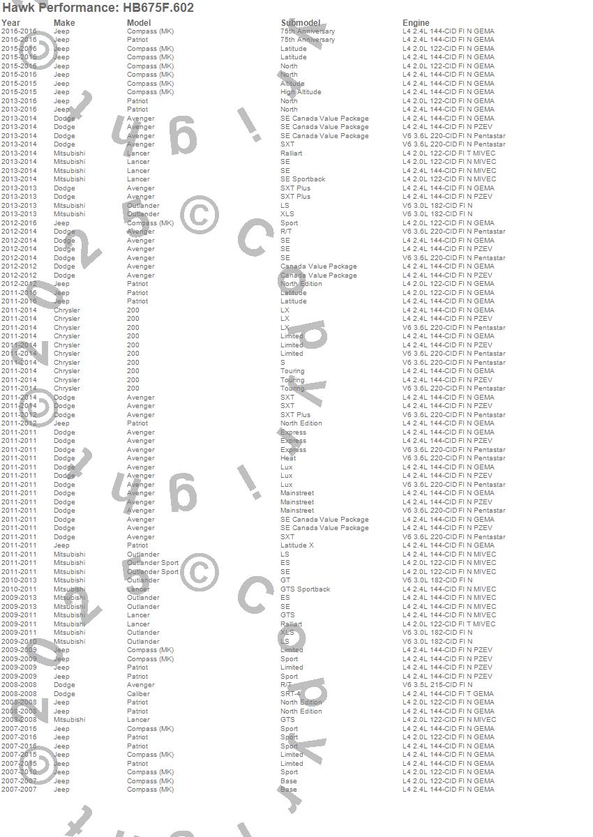 Below is an abreviated list of applications for the HPS Disc Brake Pad.200, Avenger, Caliber, Compass, Lancer, Outlander, Outlander Sport, Patriot, Chrysler, Dodge, Jeep, Mitsubishi, 2016, 2015, 2014, 2013, 2012, 2011, 2010, 2009 moreā¦