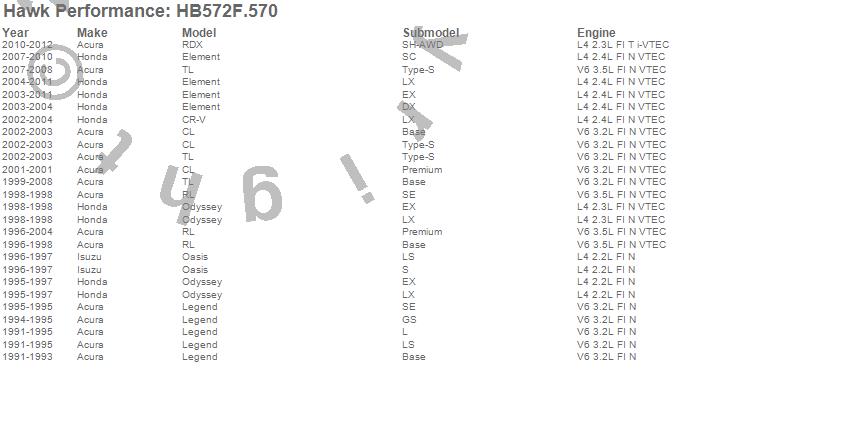 Below is an abreviated list of applications for the HPS Disc Brake Pad.CL, CR-V, Element, Legend, Oasis, Odyssey, RDX, RL, TL, Acura, Honda, Isuzu, 2012, 2011, 2010, 2009, 2008, 2007, 2006, 2005 moreā¦