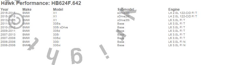 Below is an abreviated list of applications for the HPS Disc Brake Pad.330i, 330xi, 335d, 335i, 335i xDrive, 335is, 335xi, X1, BMW, 2015, 2014, 2013, 2012, 2011, 2010, 2009, 2008, 2007, 2006 moreā¦