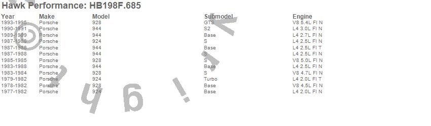Below is an abreviated list of applications for the HPS Disc Brake Pad.924, 928, 944, Porsche, 1995, 1994, 1993, 1991, 1990, 1989, 1988, 1987, 1986, 1985, 1984, 1983, 1982, 1981, 1980, 1979 moreā¦