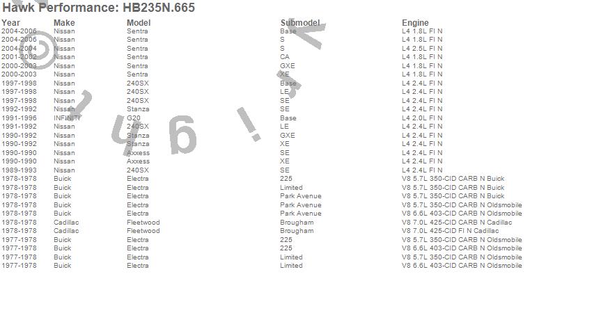 Below is an abreviated list of applications for the HP Plus Disc Brake Pad.240SX, Axxess, Electra, Fleetwood, G20, Sentra, Stanza, Buick, Cadillac, INFINITI, Nissan, 2006, 2005, 2004, 2003, 2002, 2001, 2000, 1998, 1997 moreā¦