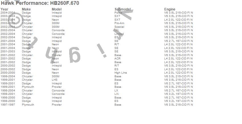 Below is an abreviated list of applications for the HPS Disc Brake Pad.300M, Concorde, Intrepid, LHS, Neon, Prowler, Chrysler, Dodge, Plymouth, 2004, 2003, 2002, 2001, 2000, 1999, 1998, 1997 moreā¦