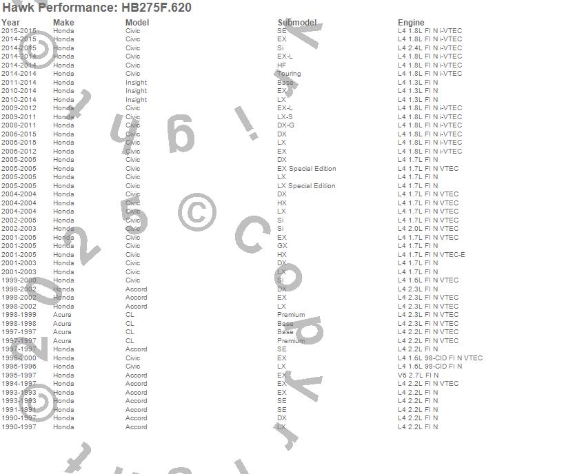 Below is an abreviated list of applications for the HPS Disc Brake Pad.Accord, Civic, CL, Insight, Acura, Honda, 2015, 2014, 2013, 2012, 2011, 2010, 2009, 2008, 2007, 2006, 2005, 2004, 2003, 2002 moreā¦