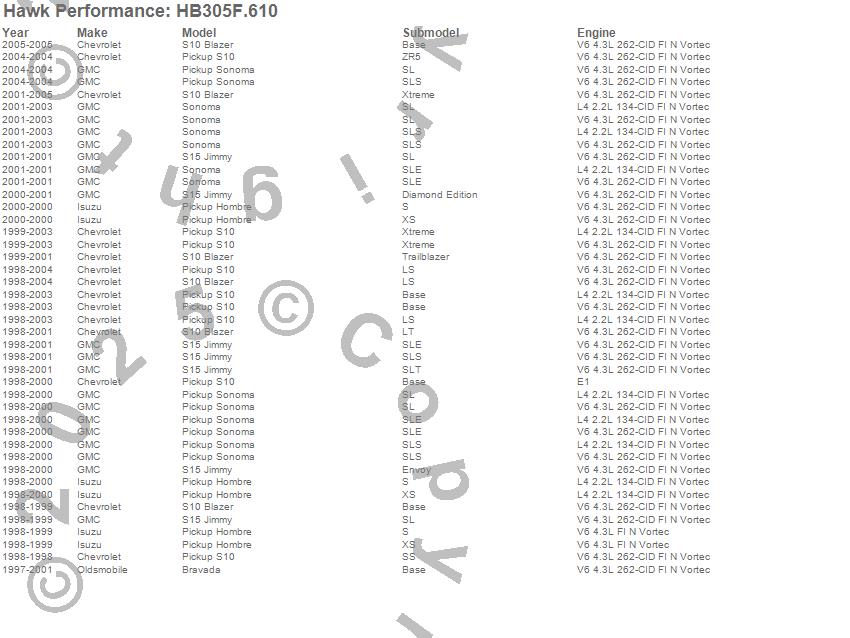 Below is an abreviated list of applications for the HPS Disc Brake Pad.Bravada, Hombre, S10 Blazer, S10 Pickup, S15 Jimmy, Sonoma, Chevrolet, GMC, Isuzu, Oldsmobile, 2005, 2004, 2003, 2002, 2001, 2000, 1999, 1998, 1997 moreā¦