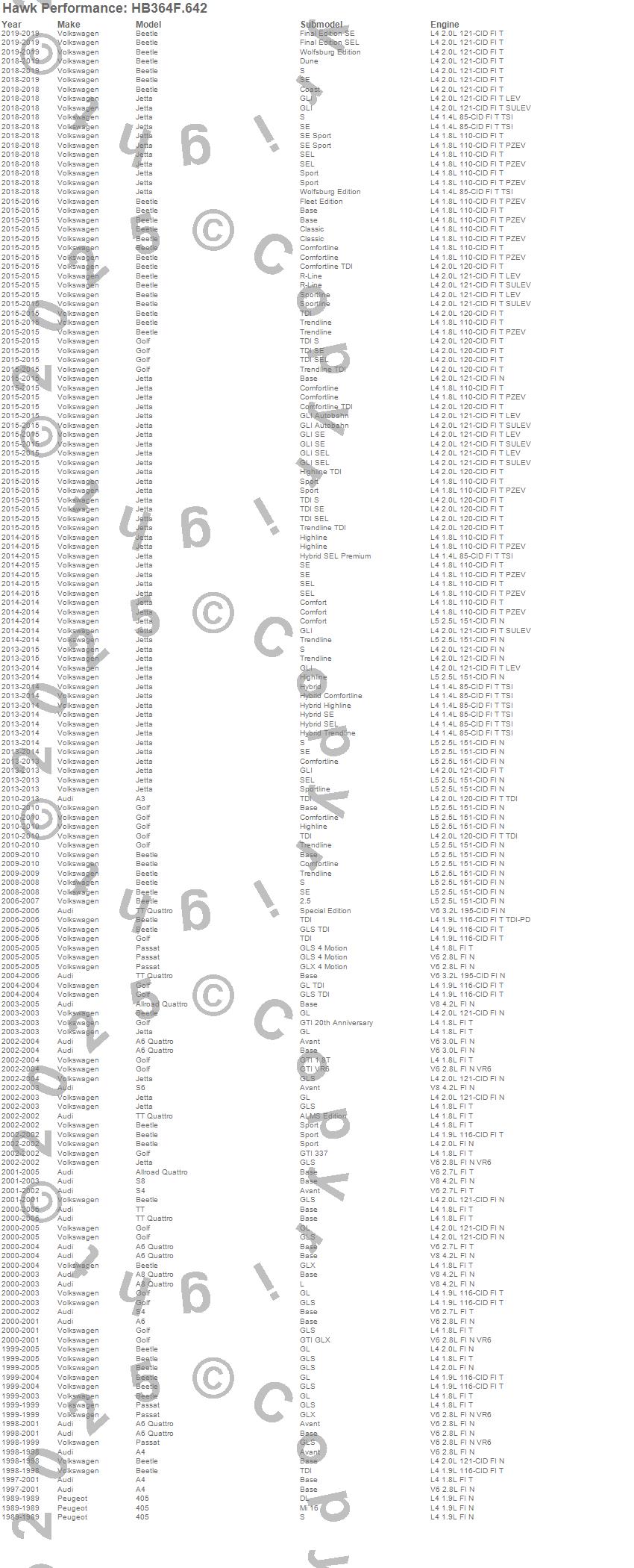 Below is an abreviated list of applications for the HPS Disc Brake Pad.405, A3, A4, A6, A6 Quattro, A8 Quattro, Allroad Quattro, Beetle, Golf, Jetta, Passat, S4, S6, S8, TT, TT Quattro, Audi, Peugeot, Volkswagen, 2019 moreā¦
