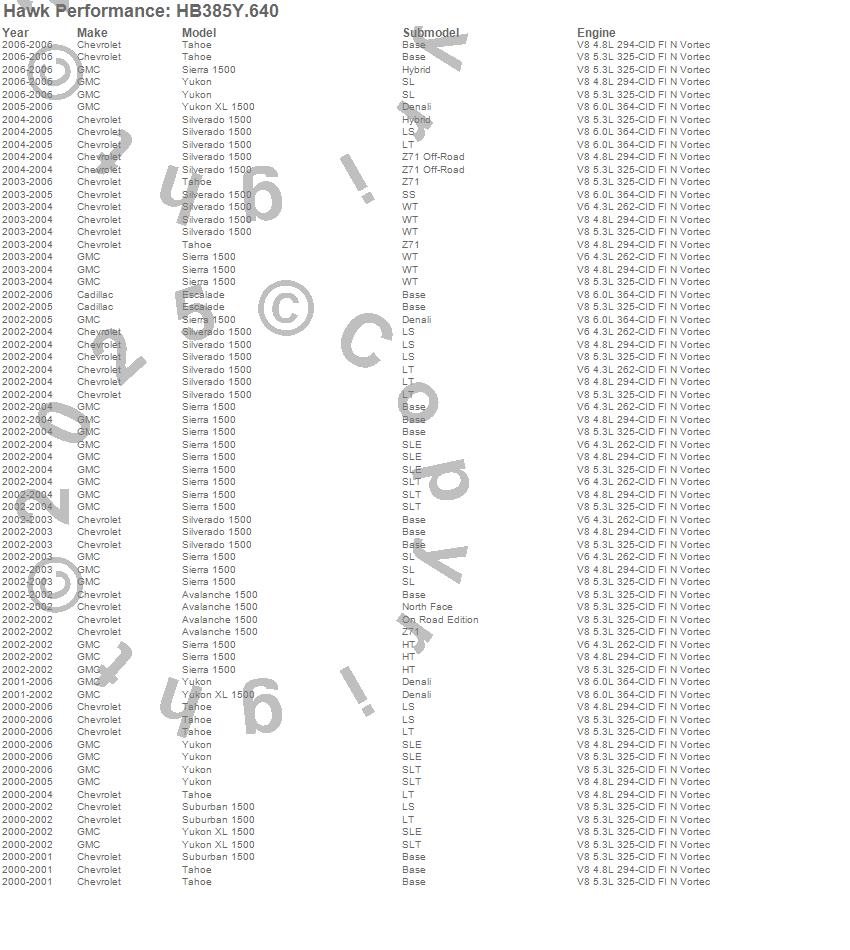 Below is an abreviated list of applications for the LTS Disc Brake Pad.Avalanche 1500, Escalade, Sierra 1500, Silverado 1500, Suburban 1500, Tahoe, Yukon, Yukon XL 1500, Cadillac, Chevrolet, GMC, 2006, 2005, 2004, 2003, 2002, 2001, 2000 moreā¦