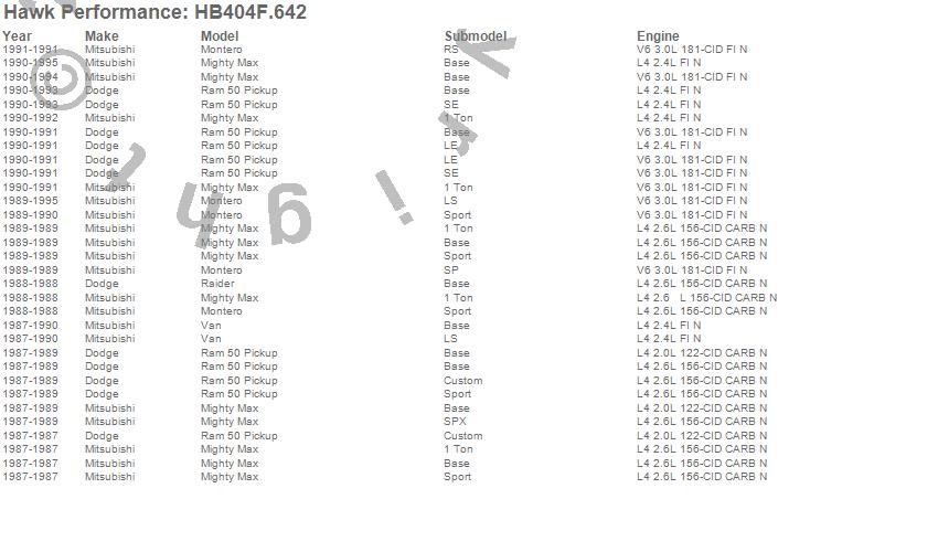 Below is an abreviated list of applications for the HPS Disc Brake Pad.Mighty Max, Montero, Raider, Ram 50 Pickup, Van, Dodge, Mitsubishi, 1995, 1994, 1993, 1992, 1991, 1990, 1989, 1988, 1987 moreā¦