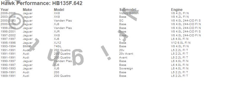 Below is an abreviated list of applications for the HPS Disc Brake Pad.200, 200 Quattro, 740iL, Vanden Plas, XJ12, XJ6, XJ8, XJR, XK8, Audi, BMW, Jaguar, 2006, 2005, 2004, 2003, 2002, 2001, 2000, 1999 moreā¦
