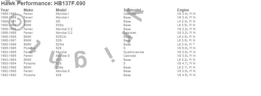 Below is an abreviated list of applications for the HPS Disc Brake Pad.524td, 528e, 533i, 535i, 535is, 635CSi, 928, M3, Mondial, Mondial 3.2, Mondial 8, Mondial t, BMW, Ferrari, Porsche, 1993, 1992, 1991, 1990, 1989 moreā¦