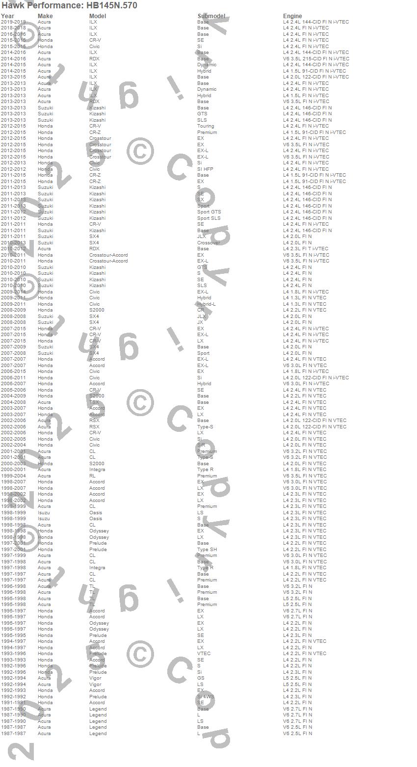 Below is an abreviated list of applications for the HP Plus Disc Brake Pad.Accord, Accord Crosstour, Civic, CL, CR-V, CR-Z, Crosstour, ILX, Integra, Kizashi, Legend, Oasis, Odyssey, Prelude, RDX, RL, RSX, S2000, SX4, TL moreā¦